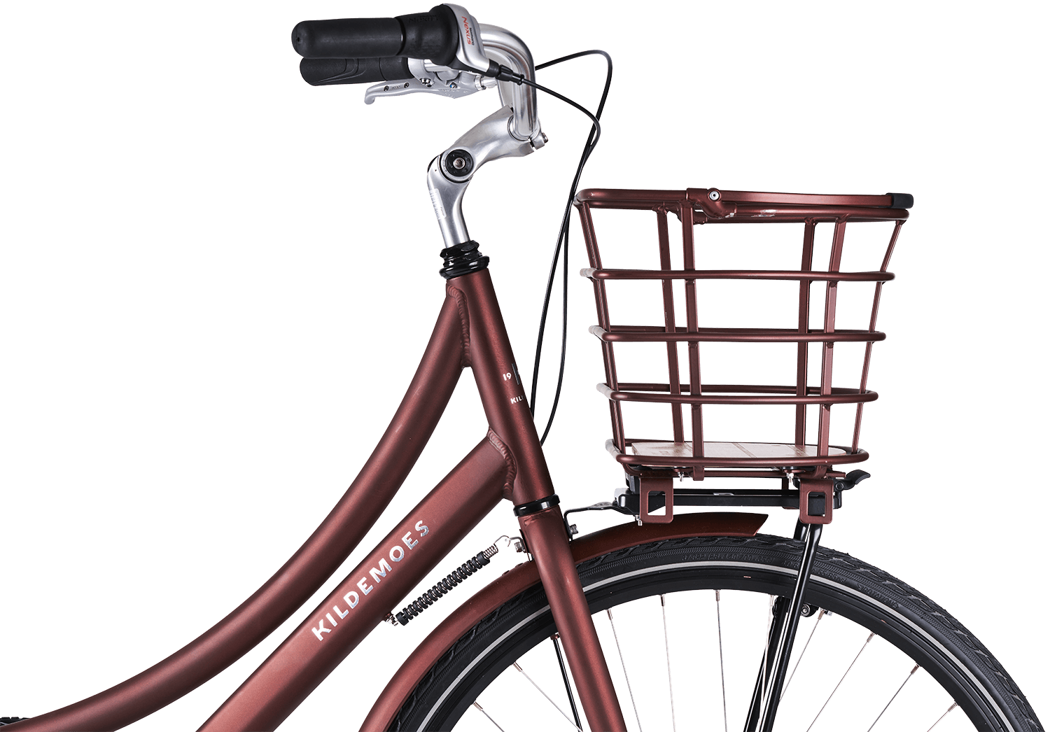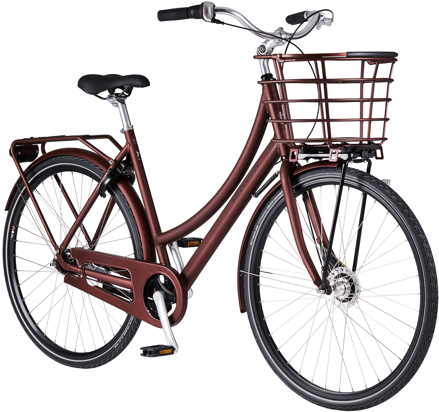 Kildemoes nostalgisk damecykel med 7 indvendige gear fra Shimano, en kombination af fodbremse og rullebremse, farvet udstyr og aftagelig AVS aluminiumskurv.