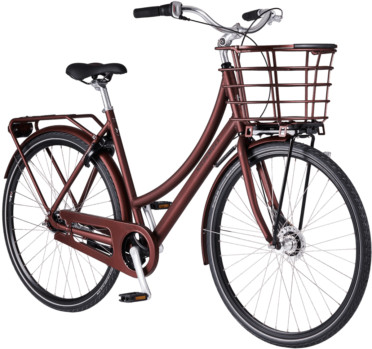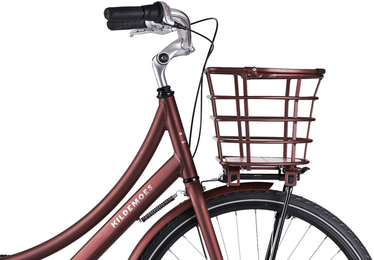 Kildemoes nostalgisk damecykel med 7 indvendige gear fra Shimano, en kombination af fodbremse og rullebremse, farvet udstyr og aftagelig AVS aluminiumskurv.